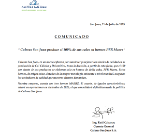 Desde el departamento de prensa de la empresa Caleras San Juan emitieron un comunicado donde informan lo siguiente: