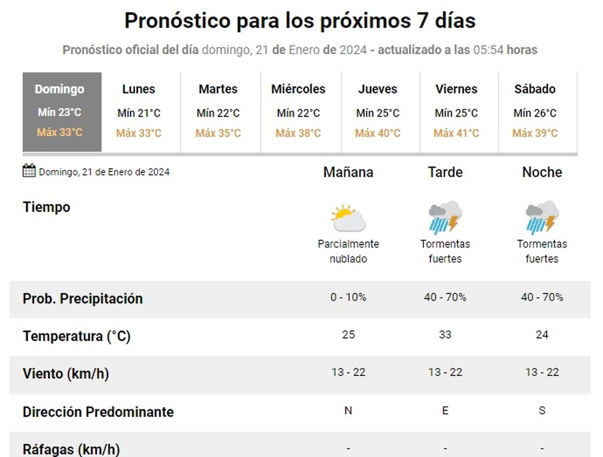 El domingo comenzó con una mínima de 22°C, viento Sur a 35 km/h y cielo parcialmente nublado con polvo levantado por tiempo, según el Servicio Meteorológico Nacional. En tanto que la máxima llegaría a los 33°C.