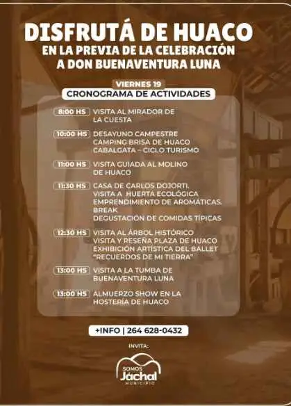 Previamente, durante el día se desarrollará un cronograma de actividades turísticas para poder disfrutar de Huaco, sus paisajes, historia y cultura.