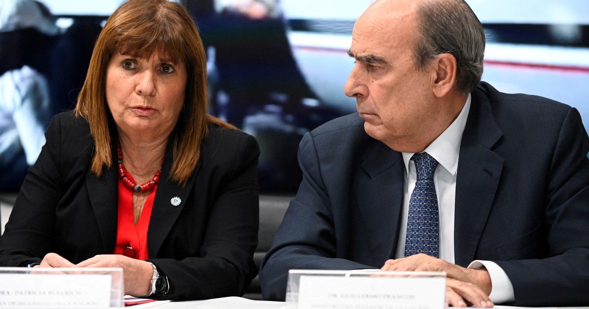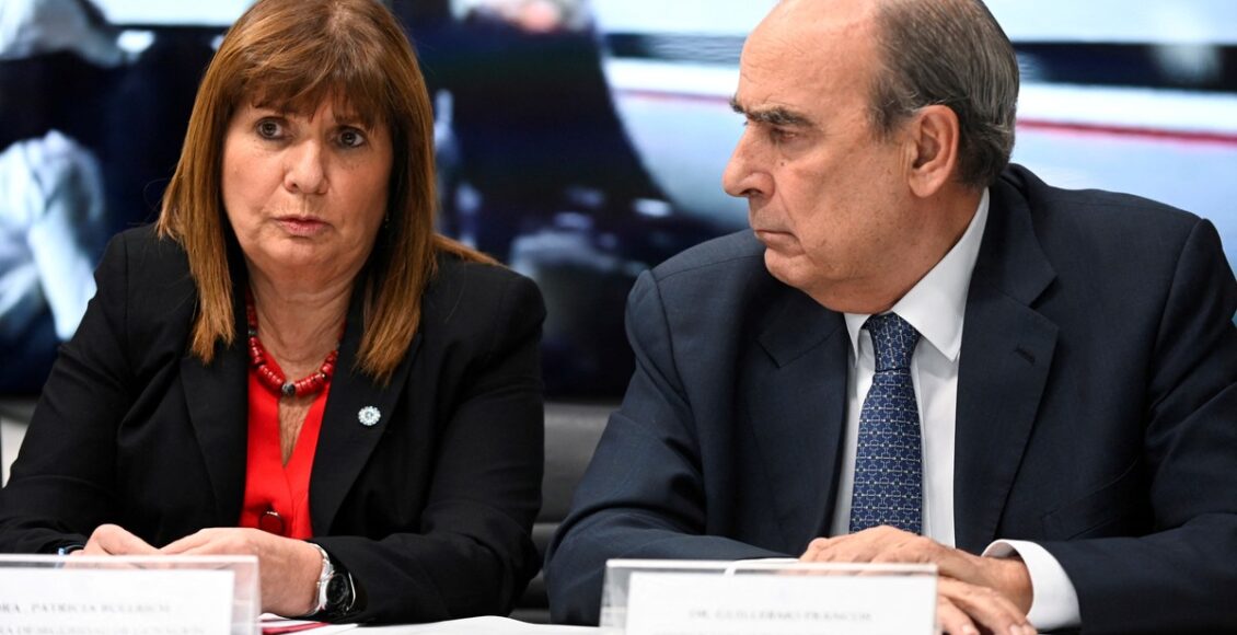 Los ministros de Seguridad, Patricia Bullrich (d); de Defensa, Luis Petri (i), y del Interior, Guillermo Francos (2d), observan una pantalla que muestra el operativo de deportación de los allegados al criminal ecuatoriano 'Fito' Macías, durante una rueda de prensa. Los ministros de Seguridad, Patricia Bullrich (d); de Defensa, Luis Petri (i), y del Interior, Guillermo Francos (2d), observan una pantalla que muestra el operativo de deportación de los allegados al criminal ecuatoriano 'Fito' Macías, durante una rueda de prensa.