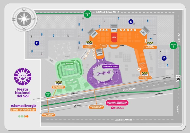 La puerta 3, 4, 5 y 6 están ubicadas sobre Ruta 40, a metros se ubica la boletería A y se puede ingresar de manera directa al Estadio para disfrutar los recitales, donde estarán los artistas nacionales. La boletería B vincula de manera directa con el acceso peatonal a la feria.