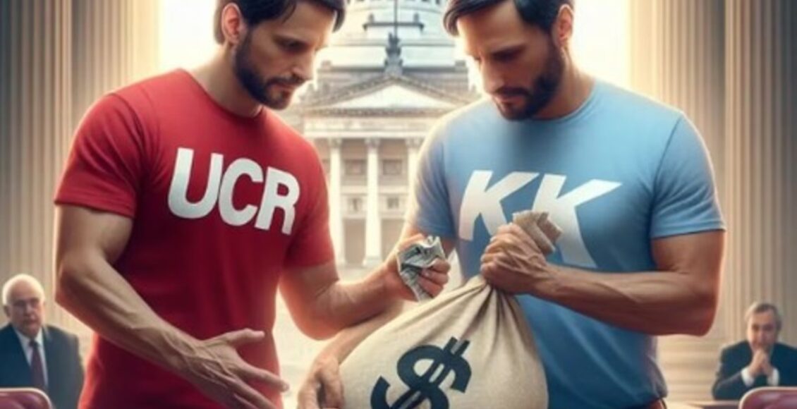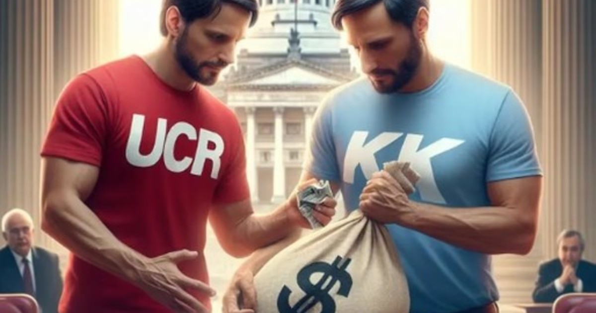La foto en cuestión era un meme que muestra a dos personas pasándose una bolsa de dinero. Una de ellas tiene una remera roja que dice "UCR" en el pecho. La otra, vestida con una remera celeste con las letras "KK".